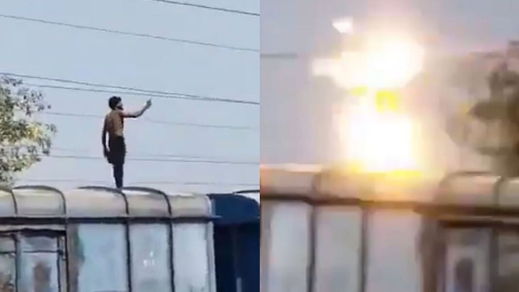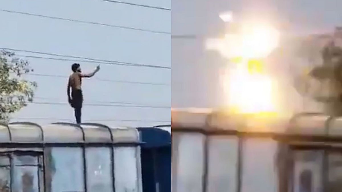 ಯುವಕ ರೈಲು ಬೋಗಿಯ ಮೇಲ್ಭಾಗದಲ್ಲಿ ನಡೆದು ಹೋಗುತ್ತಾ ಅಪಾಯಕರವಾಗಿ ಹೈ-ವೋಲ್ಟೇಜ್ ಓವರ್‌ಹೆಡ್ ವಿದ್ಯುತ್ ತಂತಿಯ ಹತ್ತಿರ ಕೈಯನ್ನು ಕೊಂಡೊಯ್ದಿದ್ದಾನೆ. ಕ್ಷಣಾರ್ಧದಲ್ಲಿ ಕೈ ವಿದ್ಯುತ್ ತಂತಿಗೆ ತಾಗಿದ ಪರಿಣಾಮ ಭಾರೀ ಸ್ಫೋಟದಂತಹ ಬೆಳಕು ಮತ್ತು ಶಬ್ದ ಉಂಟಾಗಿ ಯುವಕ ಗಂಭೀರ ವಿದ್ಯುತ್ ಶಾಕ್‌ಗೆ ಒಳಗಾಗಿದ್ದಾನೆ.